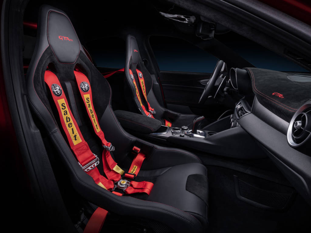 Alfa Romeo promete así una conducción súper deportiva, más allá de la excelente puesta a punto de los Quadrifoglio. Contribuyen también la reducción de peso gracias al uso de materiales ligeros como la fibra de carbono para el eje de transmisión (ya de serie en el Quadrifolio), el capó, el techo, el paragolpes delantero, la estructura de los asientos… El GTA logra un peso en la báscula de 1.520 kilos.