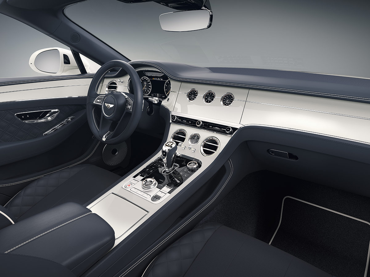 El Bentley Continental GT Convertible Bavarian Edition by Mulliner, puede diferenciarse del resto de versiones por la incorporación de detalles diferenciadores. Su pintura blanca glaciar combinada con el techo de lona azul conforma de algún modo la bandera de la región alemana.