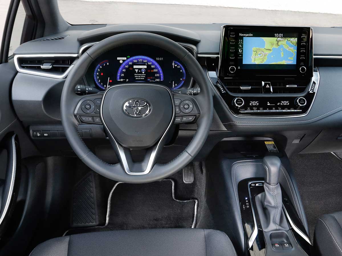 DE SERIE: llantas bitono de 18’’; levas en el volante multifunción; faros Bi-LED; cristales traseros privacidad; cargador del smartphone inalámbrico; pantalla TFT de 7’’ en el cuadro de mandos; retrovisor interior electrocromático; retrovisores exteriores abatibles eléctricamente; sensores de luces y lluvia; cámara de visión trasera; Toyota Touch 2 con pantalla multifunción de 8’’; freno de estacionamiento eléctrico; faros antiniebla LED; climatizador bizona; sistema de arranque sin llave; Toyota Safety Sense 2.0, con sistema de seguridad precolisión, control de crucero adaptativo inteligente, reconocimiento de señales de tráfico, aviso de cambio involuntario de carril y luces de carretera inteligentes; asistente de arranque en pendiente; limitador de velocidad; asiento del conductor con regulación eléctrica; sistema de reconocimiento por voz con mandos en el volante; radio MP3 con seis altavoces; seleccción modos de conducción EV, ECO y Sport; sensores de presión en los neumáticos y llamada de emergencia e-Call.