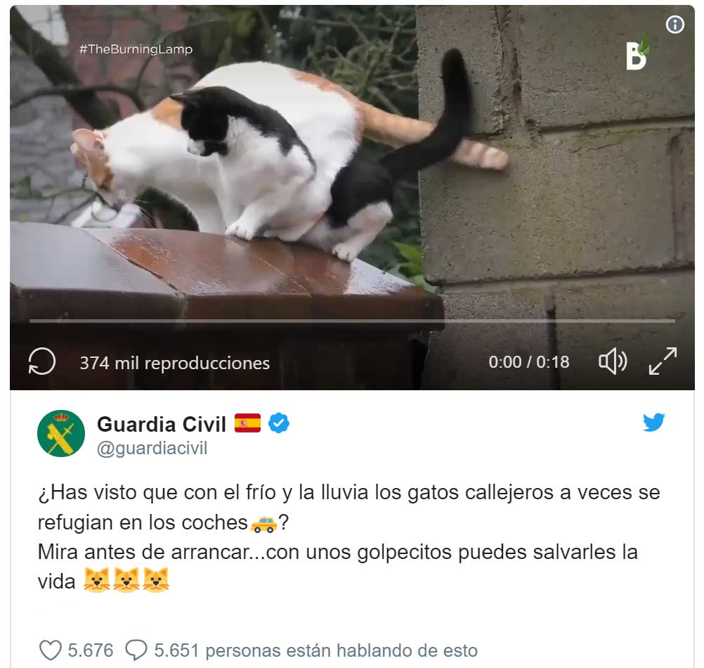 El tema es tan importante que hasta el Community Manager de la Guardia Civil de Tráfico (le mandamos un saludo, pues nos encantan sus zascas ) ha querido recordarlo en Twitter. “¿Has visto que con el frío y la lluvia los gatos callejeros a veces se refugian en los coches? Mira antes de arrancar…con unos golpecitos puedes salvarles la vida”, reza el tweet. La frase iba acompañada de un vídeo de gatos junto a vehículos; en él se ve cómo usan nuestros coches como refugio.