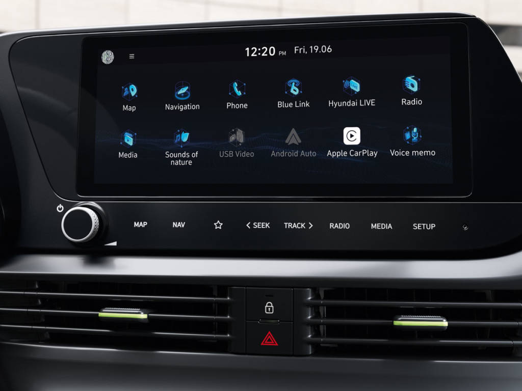 El nuevo puesto de mando integra dos pantallas digitales, cuadro de instrumentos de 10,25 pulgadas y multimedia táctil del mismo tamaño que sigue destacando sobre el salpicadero. Este incluye nuevos servicios Bluelink como la suscripción a los servicios Live durante 5 años, el control de diversas funciones desde el teléfono móvil y el control de algunos mandos mediante comando fónicos.