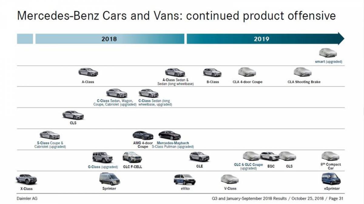 El 2018 terminará con la presentación de la Mercedes-Benz eVito que se realizará su despliegue comercial al inicio del 2019. Pocos meses después se conocerá la nueva Clase V , el vehículo de transporte de pasajeros de la comercial ligera. Y el 2019 concluirá con el lanzamiento de la Mercedes-Benz eSprinter, la versión eléctrica del furgón de carga el cual ya se sabe que tendrá una autonomía de unos 200 km.
