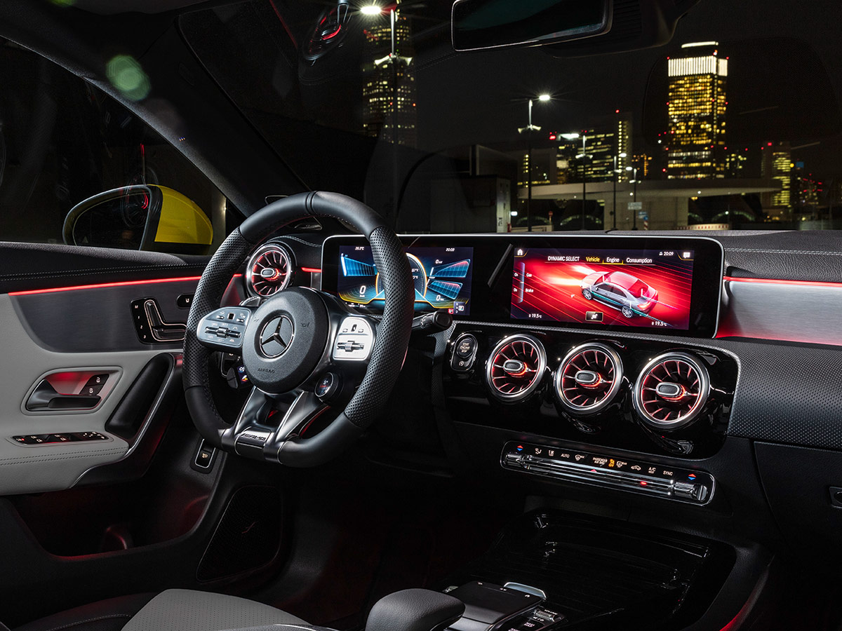 El interior es lo que menos cambia. Se introduce un nuevo volante deportivo forrado en cuero con mandos táctiles integrados, asientos deportivos y la posibilidad de contar con semibuckets. Igual que en su versión estándar, el Mercedes-AMG CLA incorpora el sistema de infoentretenimiento MBUX con asistente virtual que responde a la voz.