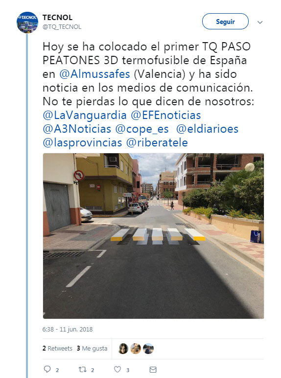 La empresa encargada de realizar este proyecto ha sido Tecnol. Una compañía que busca acabar con las cifras de accidentes con peatones y mejorar sus desplazamientos por la ciudad. Sobre todo, en las zonas sin semáforo o en las proximidades de los parques y colegios. Además, cabe destacar que está elaborado con un tipo de pintura optimizado. Es decir, una pintura mucho más resistente y llamativa que la convencional. De este modo, consiguen que los conductores se percaten antes del cruce, aumentando su capacidad de reacción.