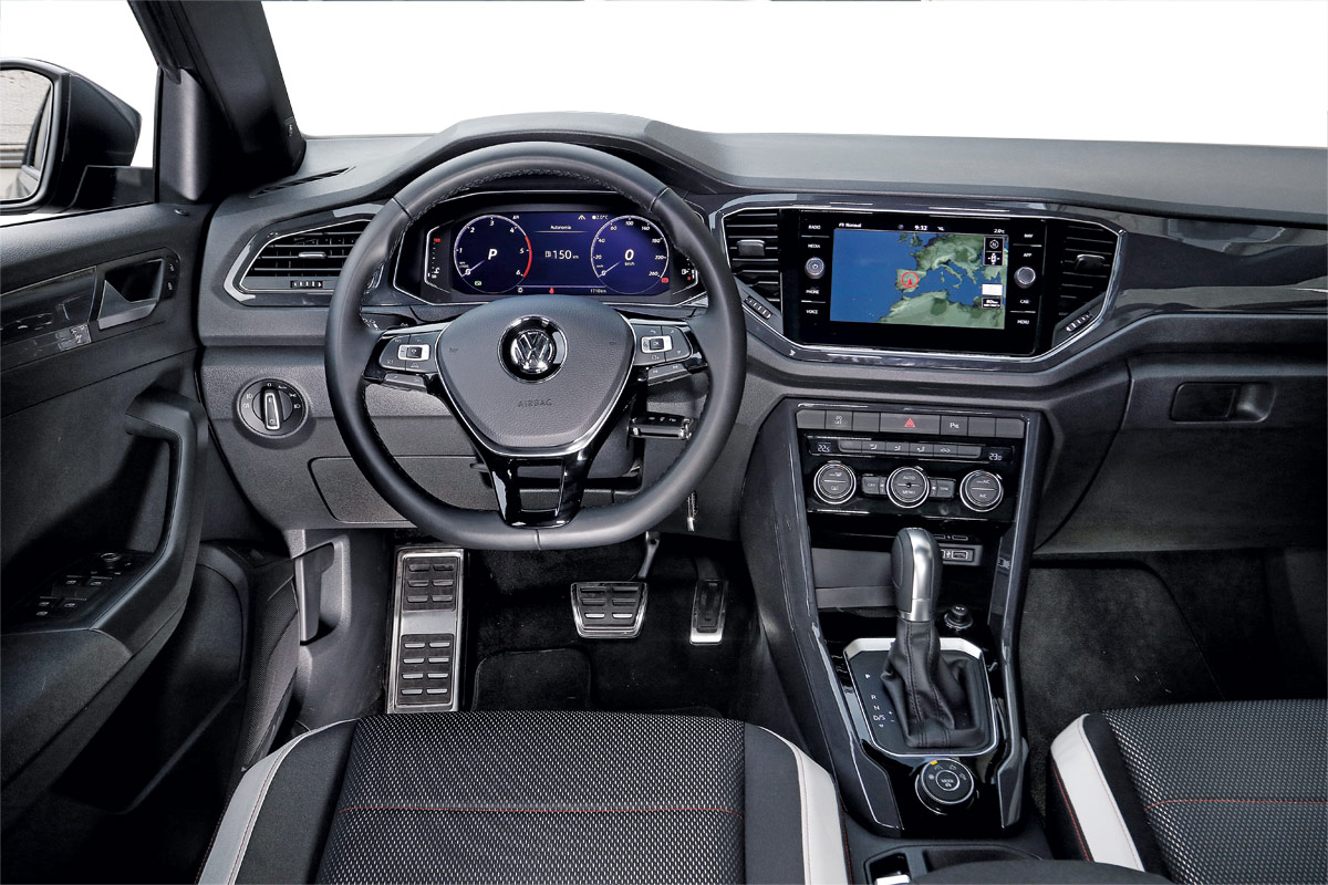 Igual de joven y fresco es el interior, presidido por una moldura a color seleccionable entre cuatro tonos. No solo da luz al habitáculo, también eleva sustancialmente la calidad del mismo… su aspecto, dicho sea de paso, más decepcionante. Aunque sólido, no hay ni un solo plástico mullido, ninguno, sea cual sea el acabado escogido, criticable cuando el precio del T-Roc supera al del Golf en unos 1.500 € de media. Un Polo también demuestra mayor impresión de calidad. Se echa de menos algún detalle de mejor tacto, sobre todo cuando otros apartados, como el multimedia, han recibido todos los mimos.