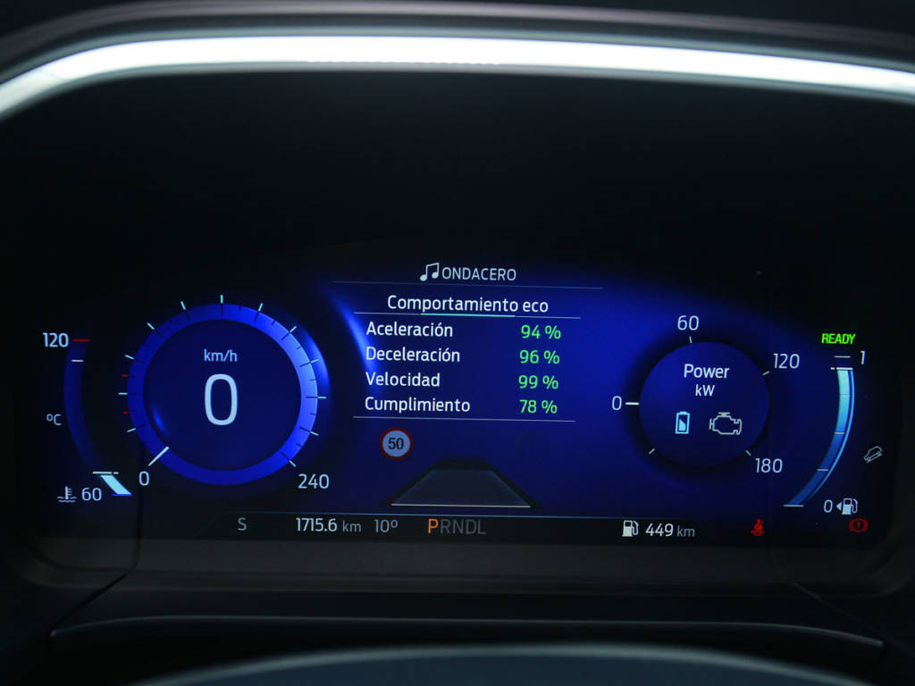Se trata de un trayecto típico que realizan miles de conductores a diario a primera hora de la mañana. Y lo mejor es que del total de esa distancia, 14 km los ha hecho de manera exclusivamente eléctrica, un 35 por ciento de trazado. Para ello accionamos el modo ECO y la función L del cambio, que intensifica claramente la frenada regenerativa. No hay opción de forzar un modo EV exclusivamente eléctrico.