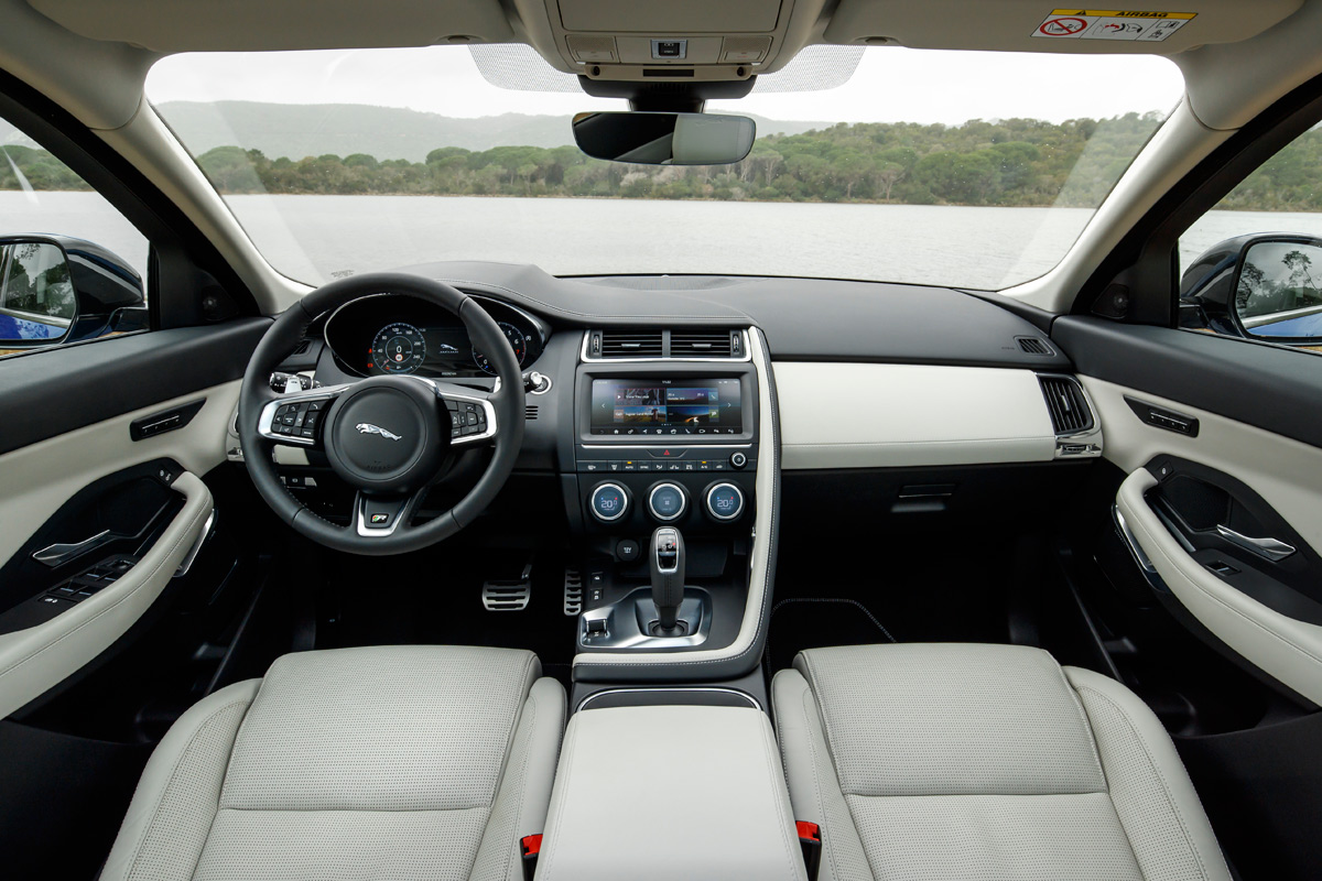 De influjo cupé, el puesto de conducción incorpora asidero central, que enfatiza el carácter deportivo. Aparece la llamativa pantalla central táctil de 10 pulgadas (de serie en toda la gama), que integra multimedia Jaguar Touch Pro, comandos circulares para la climatización (con pulsador integrado de intensidad de ventilación y calefacción de los asientos), cofre central con huecos portaobjetos (incluido uno para el móvil) y dos tomas USB. Y hay un cuadro de instrumentos digital de 12,3 pulgadas configurable.